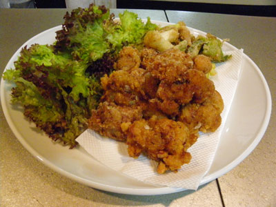 夕べの残った「唐揚げ」をあっためて、冷凍ご飯もあっためて、納豆をかけて食べる純和食。
