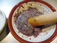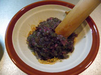 「ミズたたき」とは、何度も言うが、山菜のウワバミソウの茎を包丁の刃じゃないほうで3万回以上叩いて、叩いて、叩いた上で、最後に繊維を切るように刃で細かく切り刻み、それを擂粉木鉢(すりこぎばち)でグリグリグリグリ摺って、ネバネバが1メートルぐらい糸を引くくらいになったら、それに特製トッピングを加えて食べる、この時期特有の「秋田(特に五城目近辺がメッカではないかと思われる)の郷土料理」である。たぶん。