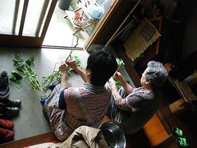 おばちゃんと今、3人で「朝イチ」を見て、これから隣のケーコさんにもらった「枝付き枝豆」を枝から外す作業をする予定です。