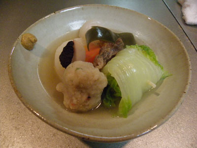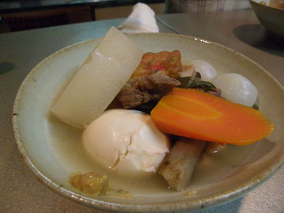 昆布、大根、人参、牛蒡、玉こん、タコ頭、牛スジ(下ごしらえしてあったもの)、練り海老団子、ロール白菜、ゆで卵、さつま揚げ、はんぺん・・・あと何だっけ。