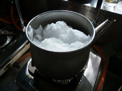 何度も何度も雪を足して、ようやく顔を洗えるくらいの水が沸いた。