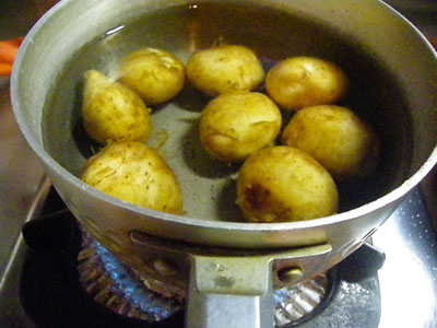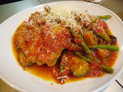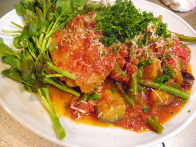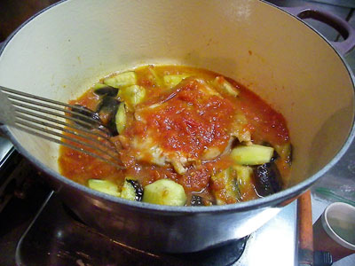 隣のコンロでは、オリーブオイルでにんにくと鶏のもも肉と茄子を焼く。こげ色がついたら、昨日煮ておいた「トマト」のソースを投入。足りないのでトマト缶も。