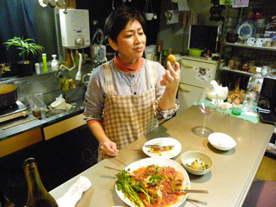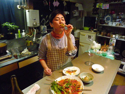 「いい香り〜!」とか言いながら、ワインをまたゴクン! 途中でインゲンさんが仲間入り。「彩りにおじゃましま〜す!」みたいな。
