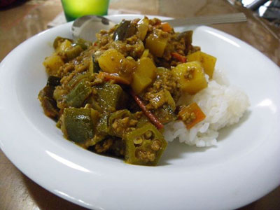 これ以上はないだろう、というぐらいの「夏野菜」を全部角切りに切って、辛〜いキーマカレーを作ってみました。ちょっとマジやばうまいッス!!!