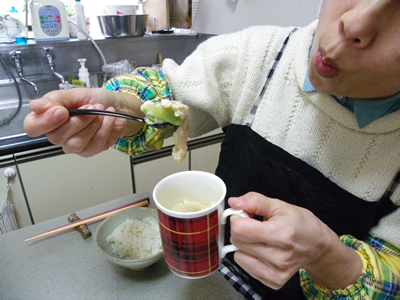 今度はボクが厚揚げを箸(納豆の)でつまみあげて食おうとしました。