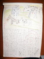 みどりの、こうげんには、うしや、うまが、たくさんはなしがい、されていて、せなかに、かいぬしの、じゅうしょと名まえが、くろくかいてあって、うしの、1年生みたいで、とてもおもしろいとおもいました。