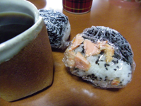 「小さいほうのおにぎり、シャケがはみ出してるよ」