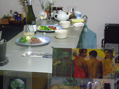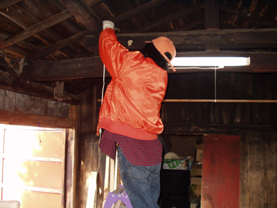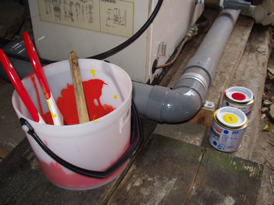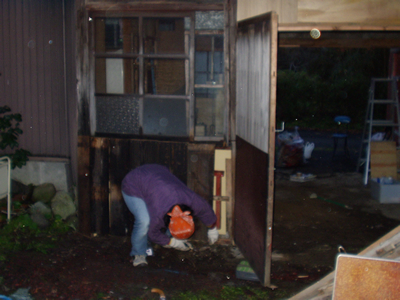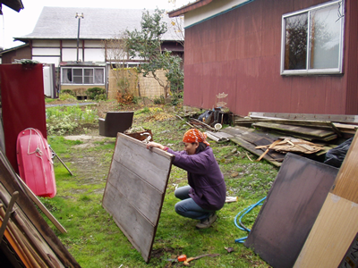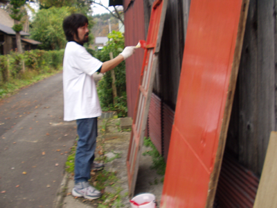 車庫を直し、その戸にペンキを塗った。 木彫りの看板も作った。