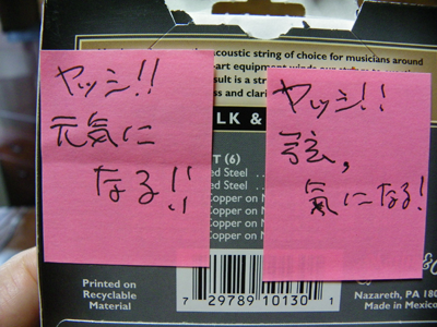 で、彼はご丁寧にギターの弦まで送ってくれたのだが、そのケースの裏にこんな紙が貼ってあった。